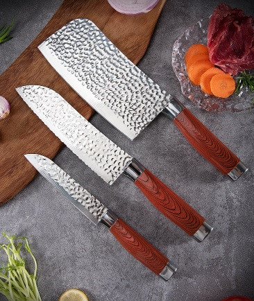Ножі кухонні KeJi KJ2-3 рифлені дбайливі до нарізаних продуктів. Продукти не приливають до леза, ножі легко чистяться. Виготовлено з неіржавкої сталі, міцного пластику та якісного покриття. Товщина леза ножа: 2.5/1.5мм Ніж сокира 30,5 см — 8 см, Кухонний ніж Santoku 30,5 см — 4,5 см Ніж кулінарний 23 см — 2,7 мм. Придатний для миття в посудомийній машині.